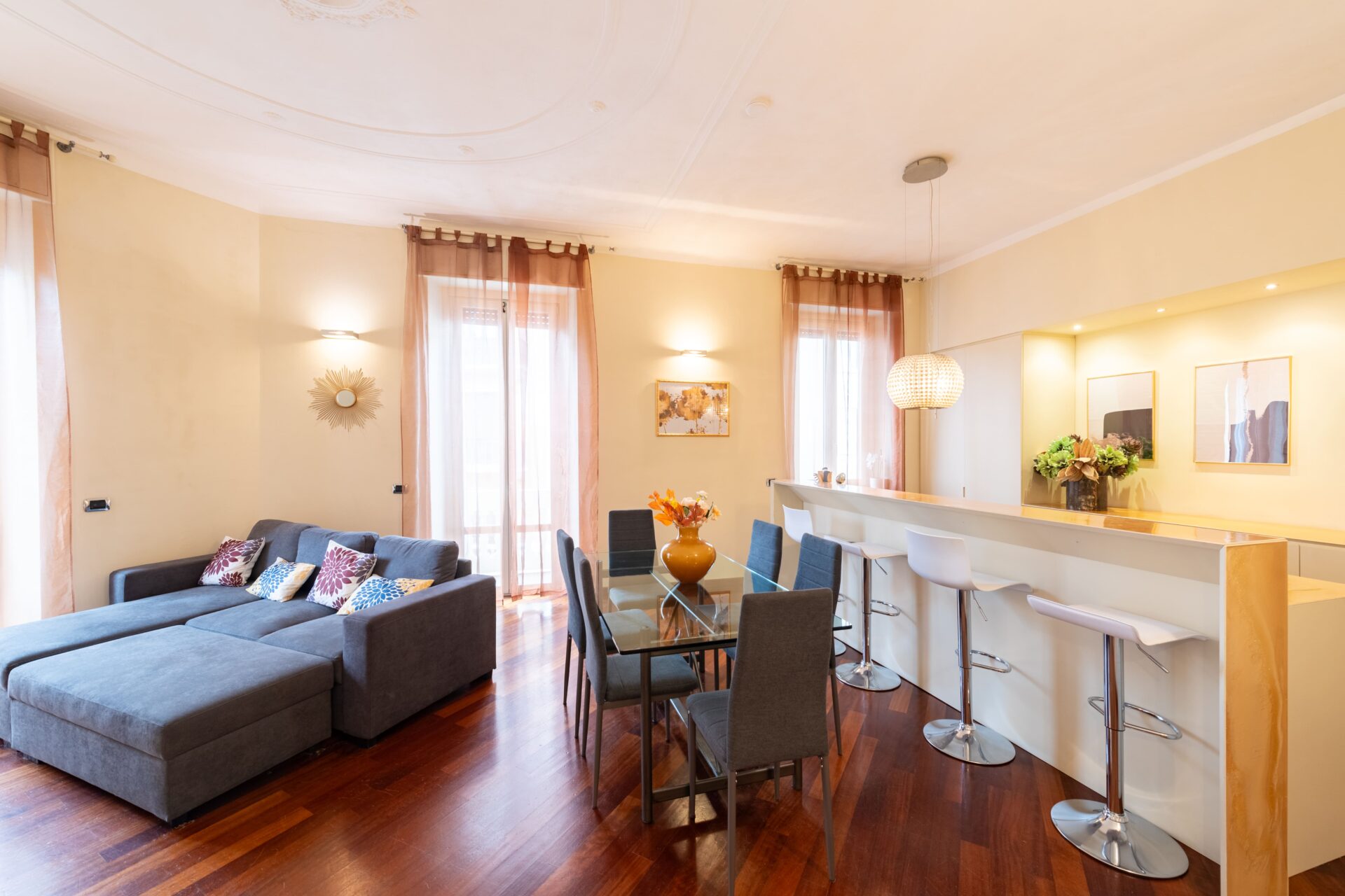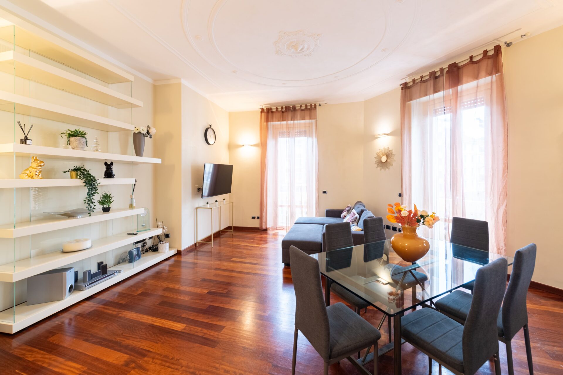 Entrando all’interno dell’appartamento verrete subito accolti dall’ampissimo e luminoso soggiorno, il quale grazie alle sue 3 finestre riesce a donare una forte luce a tutto l’ambiente.