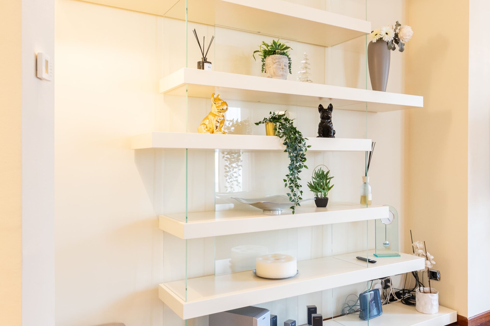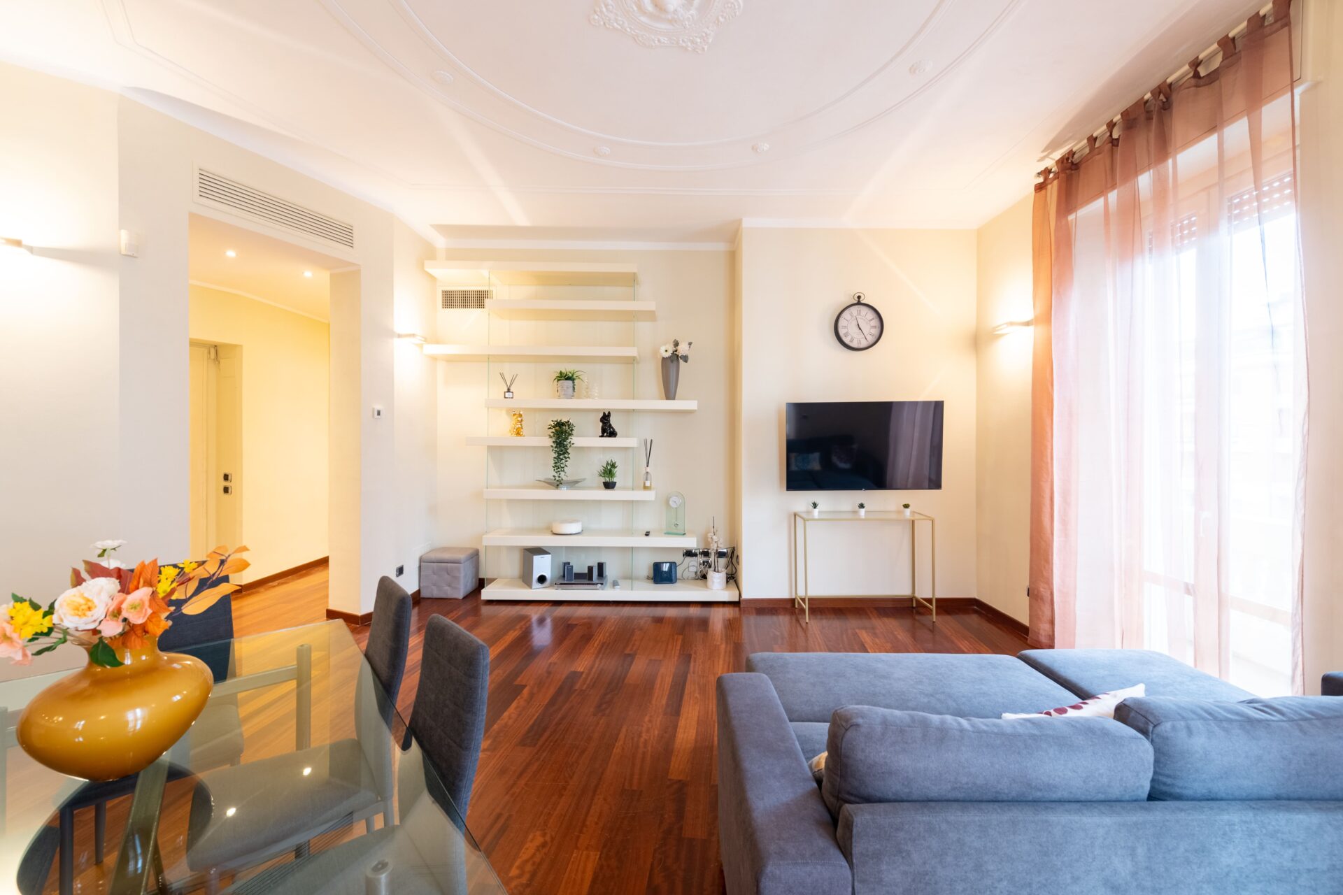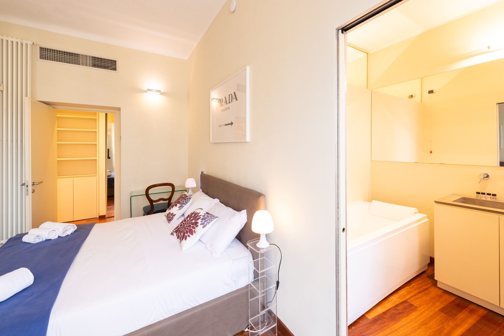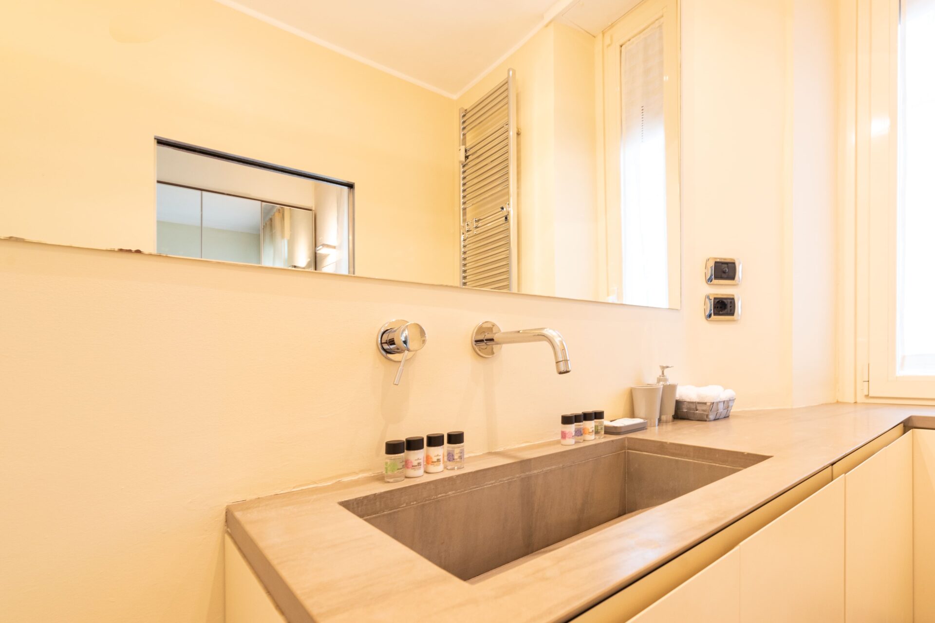 Questo spazio è caratterizzato da elementi moderni di alto design, che vanno dalla composizione mensole LAGO, alle prestigiose tende in seta, fino al divano letto con seduta relax, su cui potersi rilassare in compagnia guardando Netflix (incluso gratuitamente per tutti i nostri ospiti) sulla smart TV 4K da 55 pollici.