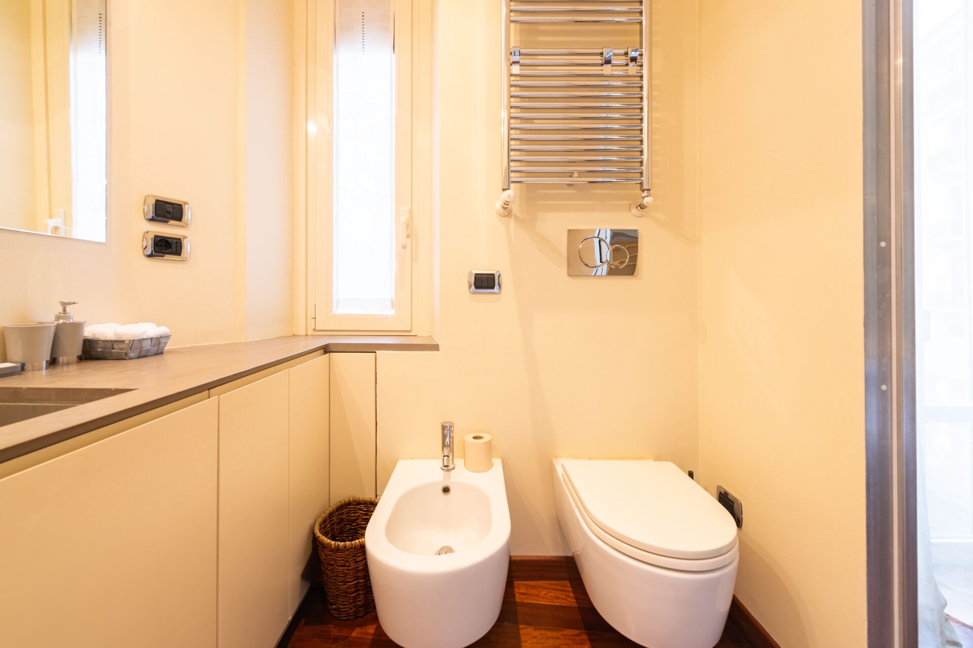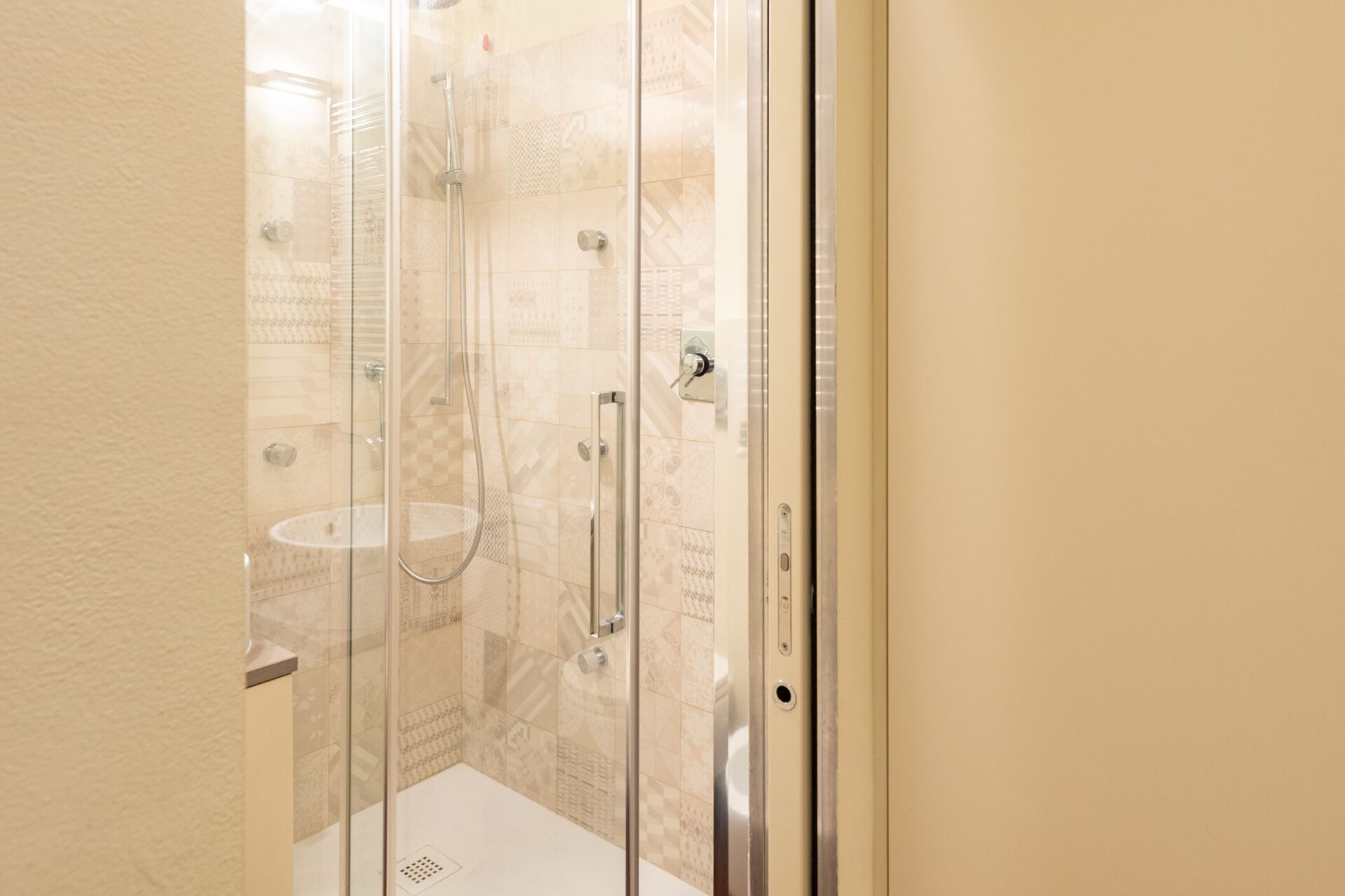 Proseguendo il tour accederete al secondo ed ultimo bagno dell’appartamento, che in questo caso è dotato sempre di sanitari completi, ma a differenza del primo è dotato di un box doccia walk-in.