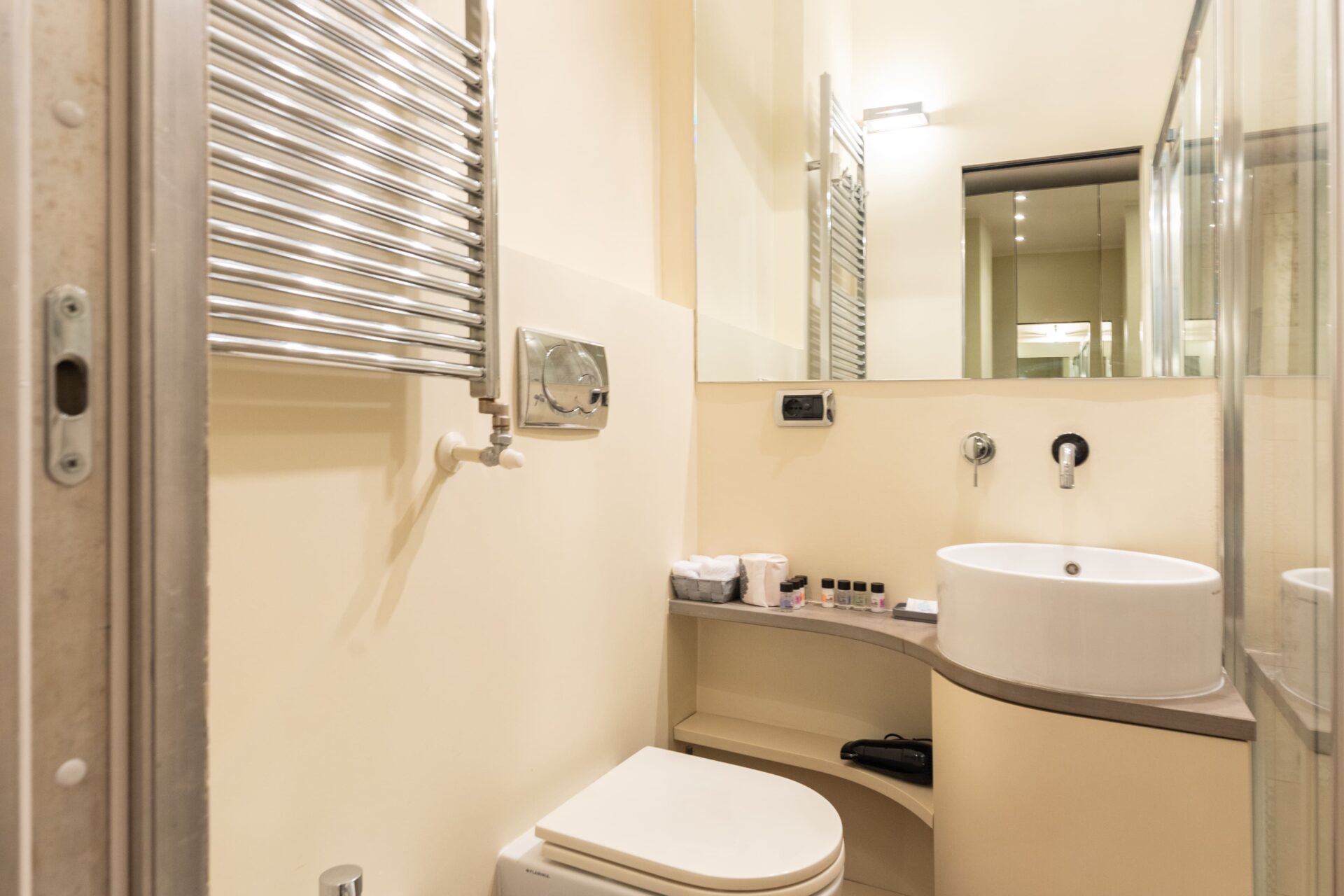 Il tutto è completato dal primo bagno privato in camera, il quale è dotato di eleganza sopraffina con pavimentazione in parquet, sanitari completi e vasca da bagno con cascata e doccino.