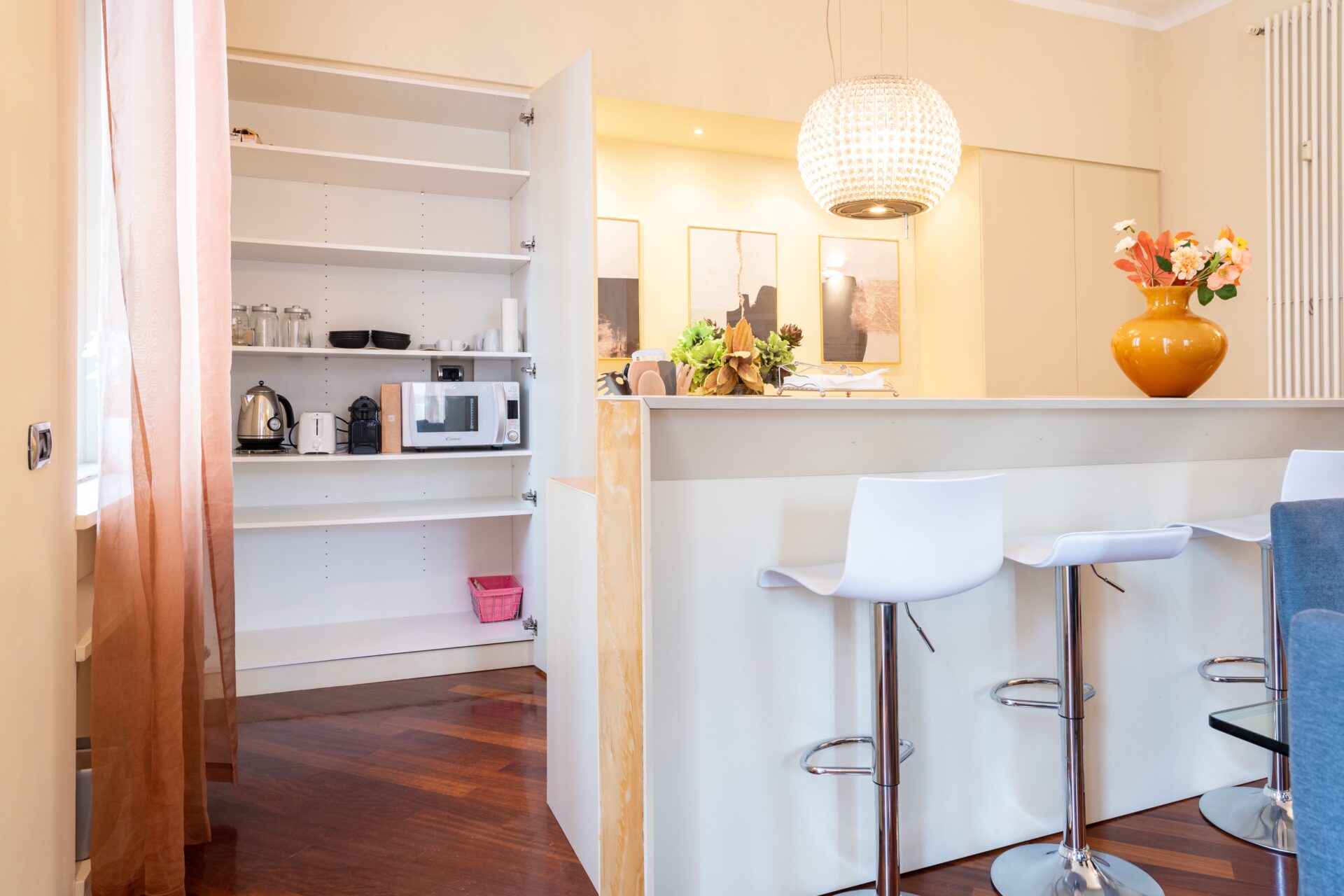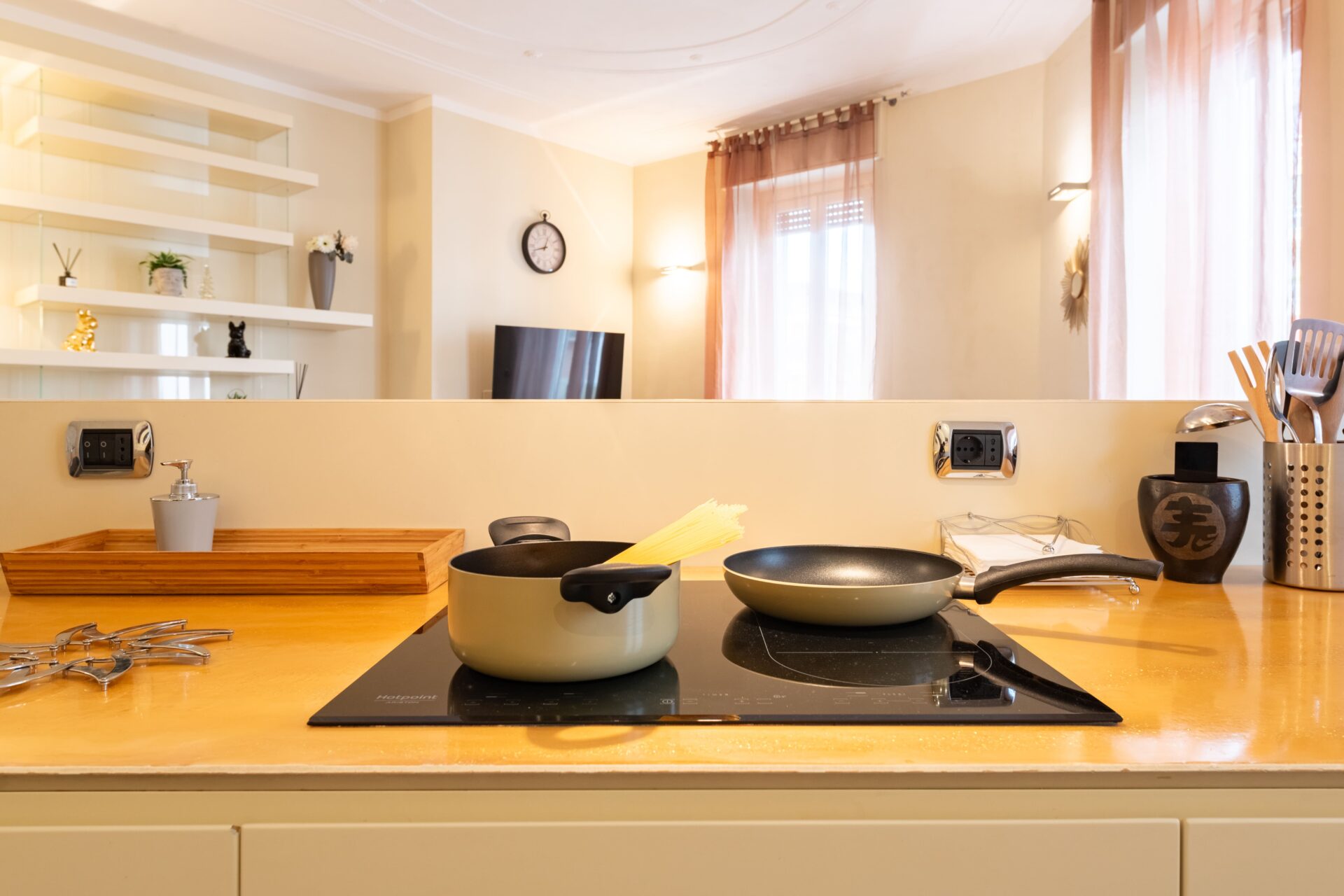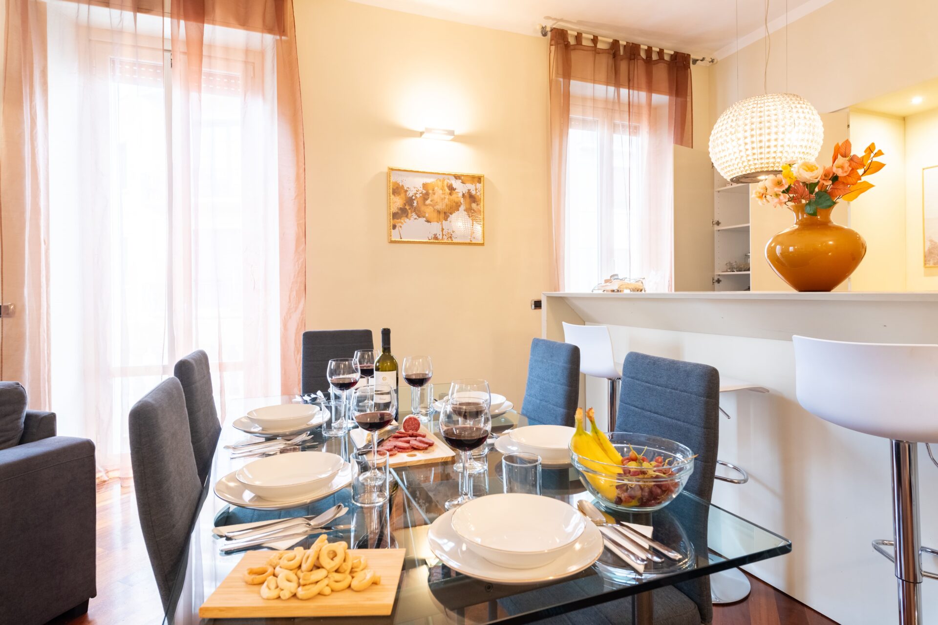 Grazie a tutto questo potrete stupire chi soggiorna con voi cucinando dei deliziosi pasti e consumarli in compagnia, seduti sui 4 sgabelli da bar o sul prestigioso tavolo in vetro in grado di ospitare fino ad 8 persone.