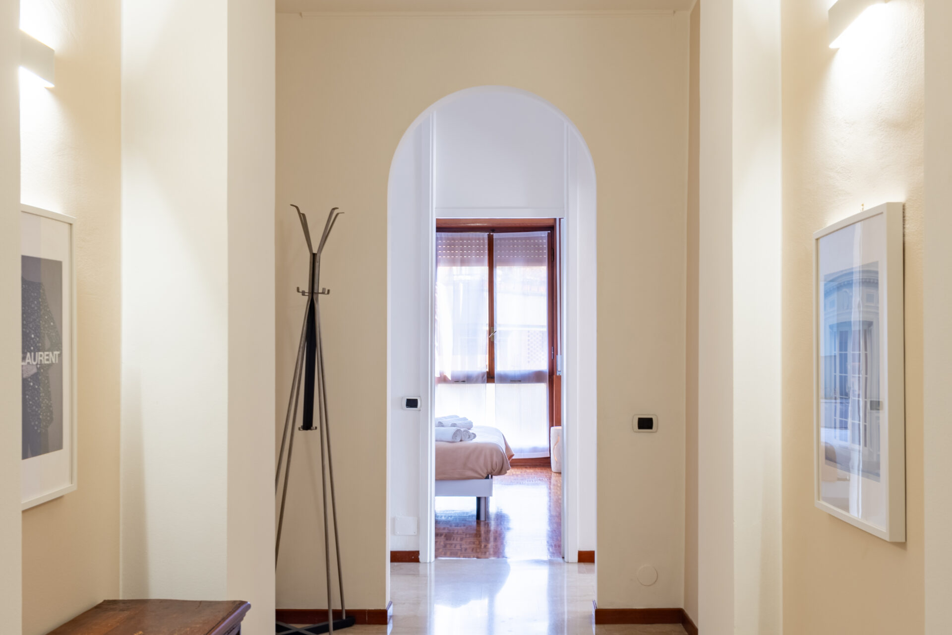 Entrando all’interno dell’appartamento verrete accolti da un grande corridoio, il quale caratterizzato dai suoi archi vintage in contrapposizione con i luci moderne e quadri di design, è in grado di conferire alla casa uno stile unico e senza tempo.