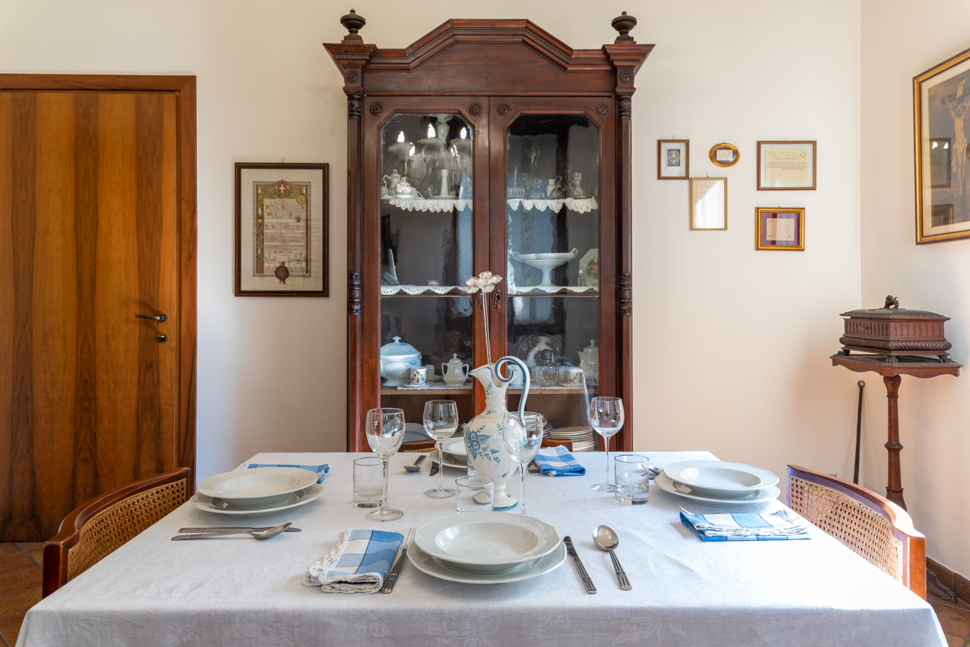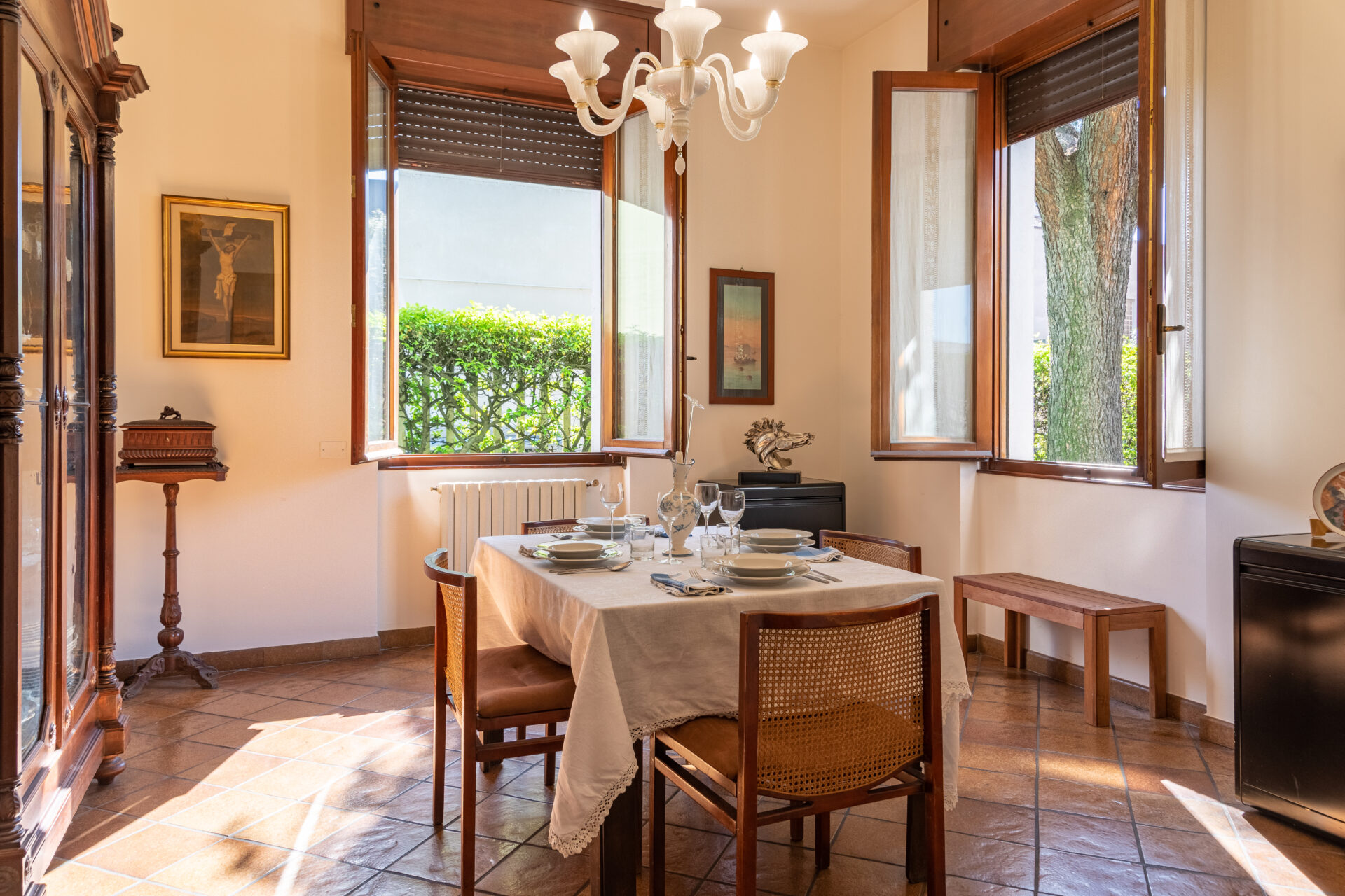 Affianco ad essa è presente una sala da pranzo arredata con eleganza ed illuminata da un bellissimo lampadario in cristallo che vi accompagnerà durante le vostre cene.