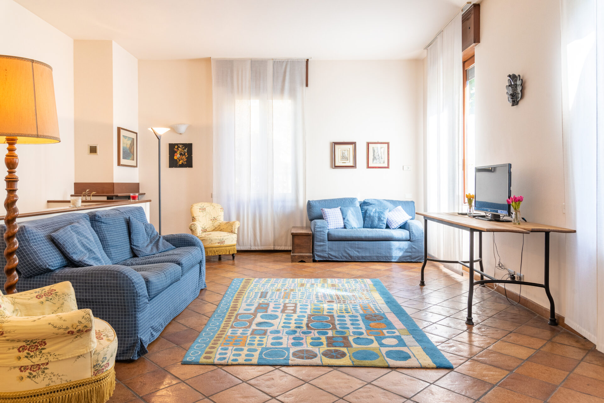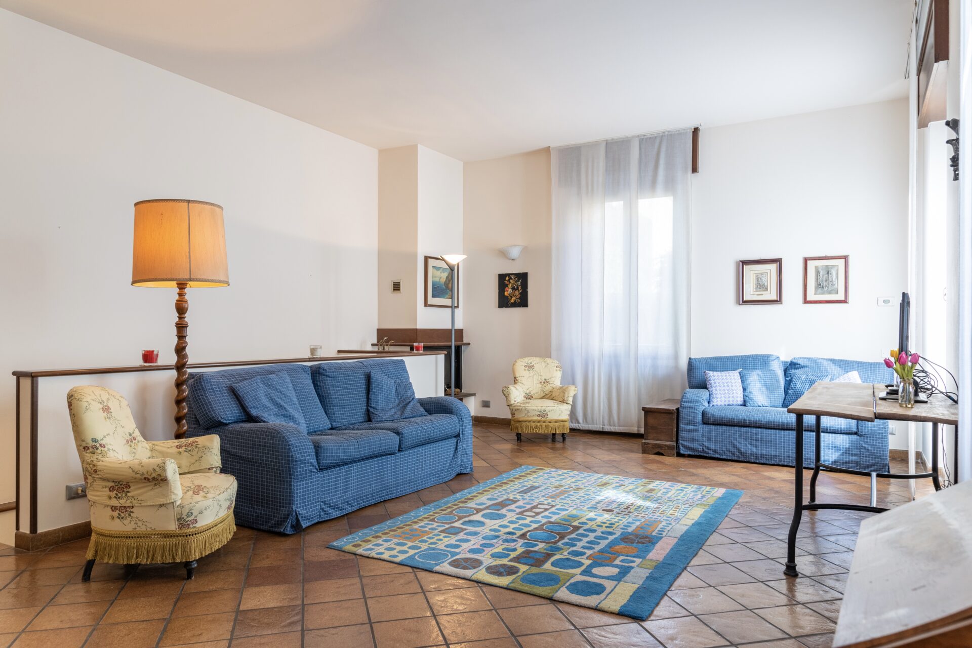 Al piano terra troverete un’elegante sala, molto accogliente e luminosa dotata di due comodi divani e due poltrone, perfetta per rilassarsi e trascorrere del tempo in compagnia.