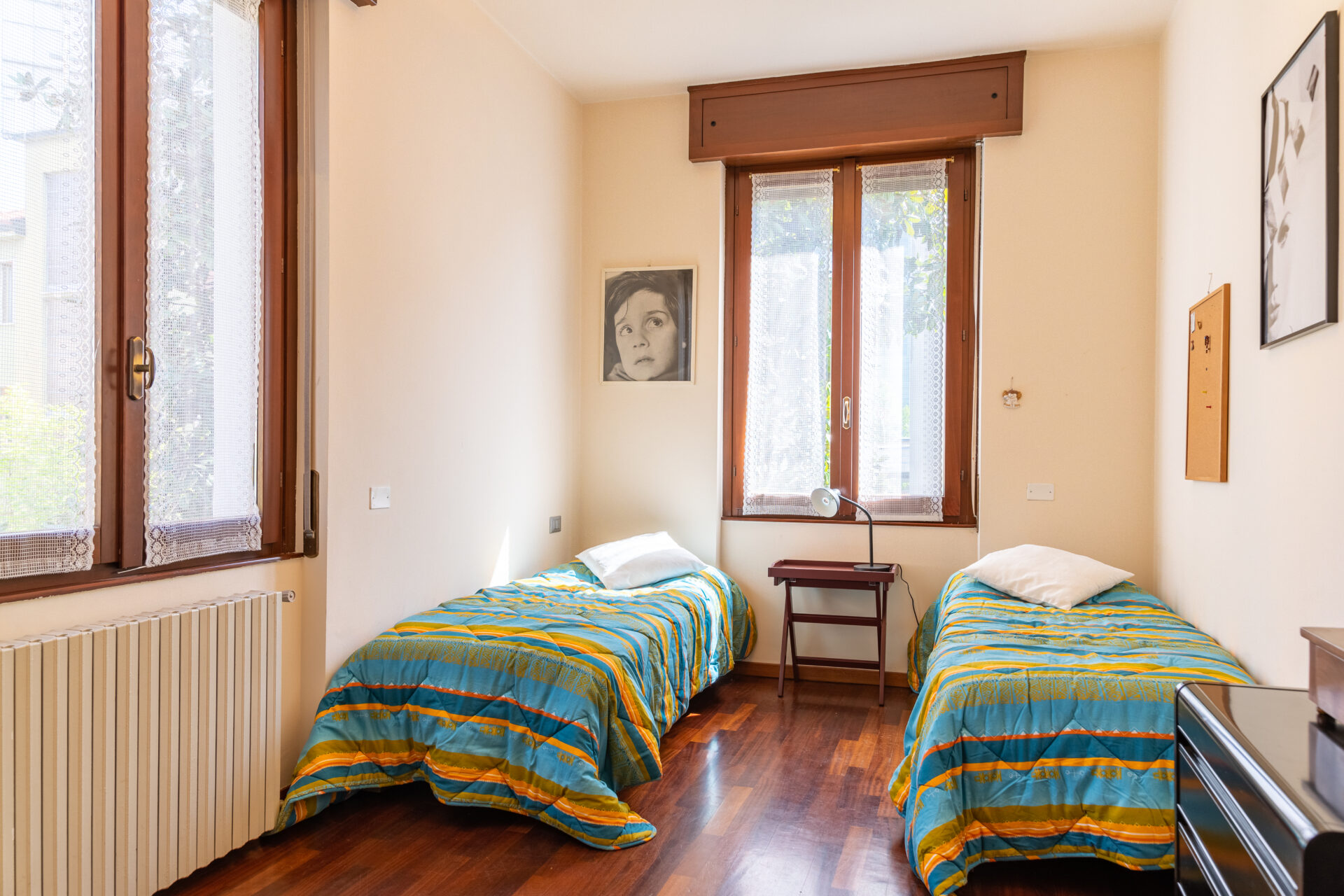 La terza camera è composta da un letto singolo ed una postazione da lavoro dedicata compresa di mouse e monitor su cui collegare il vostro laptop, mentre nella quarta ed ultima camera, potrete trovare due letti singoli.