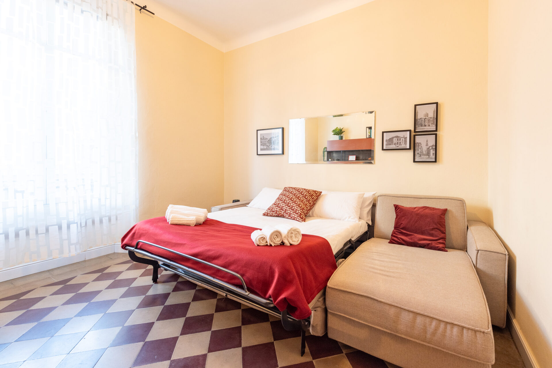 Proseguendo il tour troverete un elegante soggiorno, , dotato di un comodo divano letto su cui potervi rilassare passando intere serate all’insegna del relax e dello svago grazie alla grande smart tv con risoluzione 4k e Netflix incluso gratuitamente per tutti i nostri ospiti.