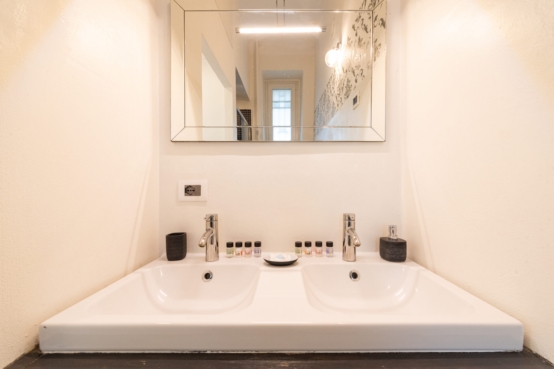 Infine è presente un elegantissimo bagno, dotato di lavandini doppi, di una spaziosa cabina doccia interamente rivestita con piastrelle a trama, sanitari completi ed infine kit di cortesia con shampoo, bagno schiuma, saponette per le mani, balsamo e crema per il corpo.