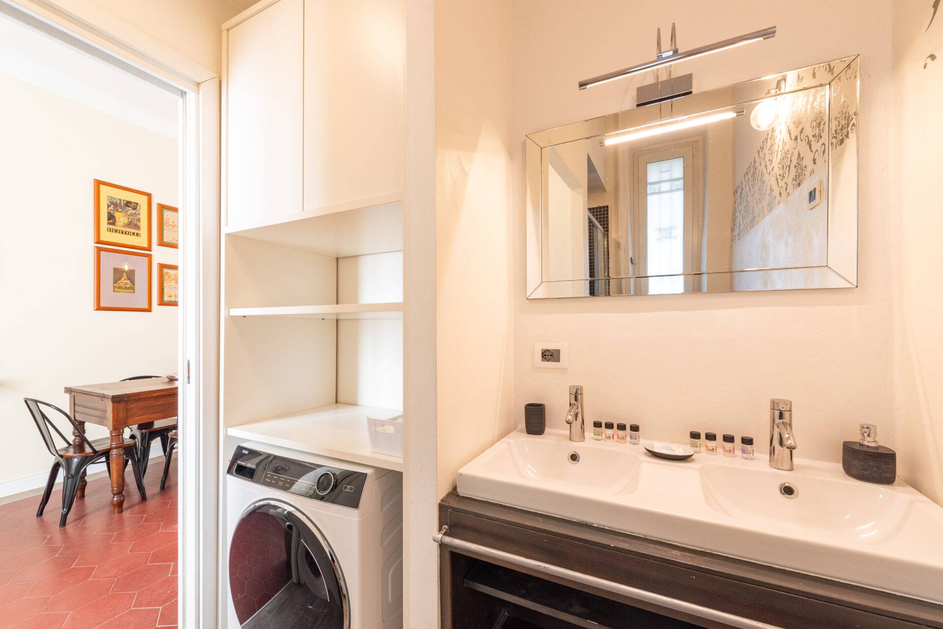 Inoltre in bagno sono presenti elettrodomestici come l’asciugacapelli e la lavatrice.