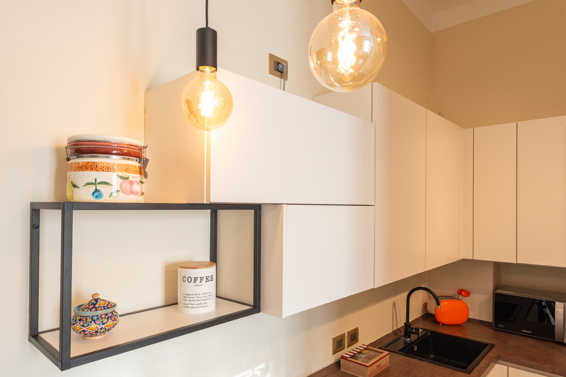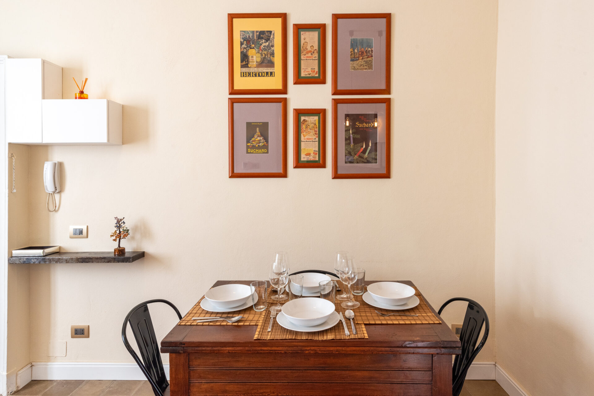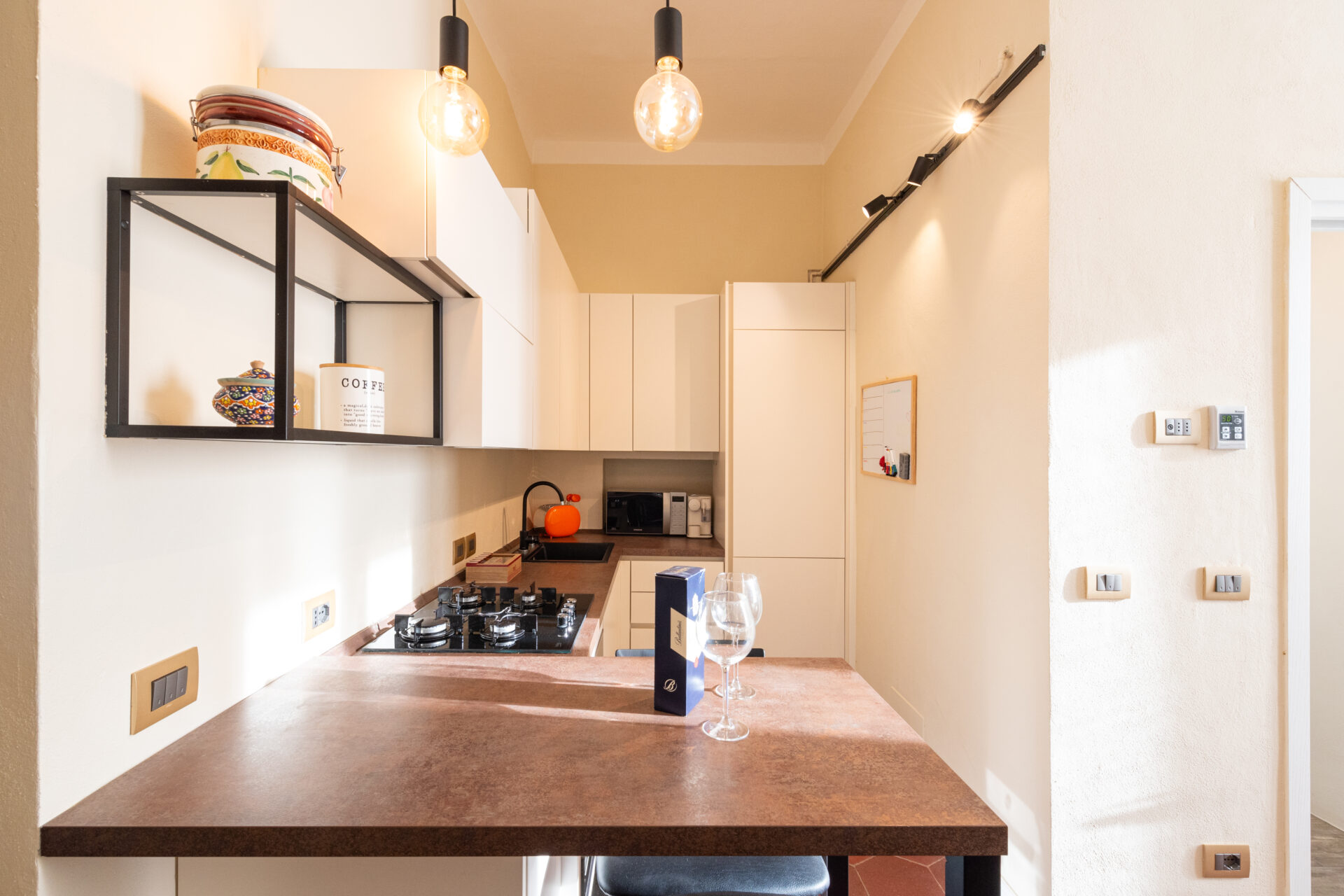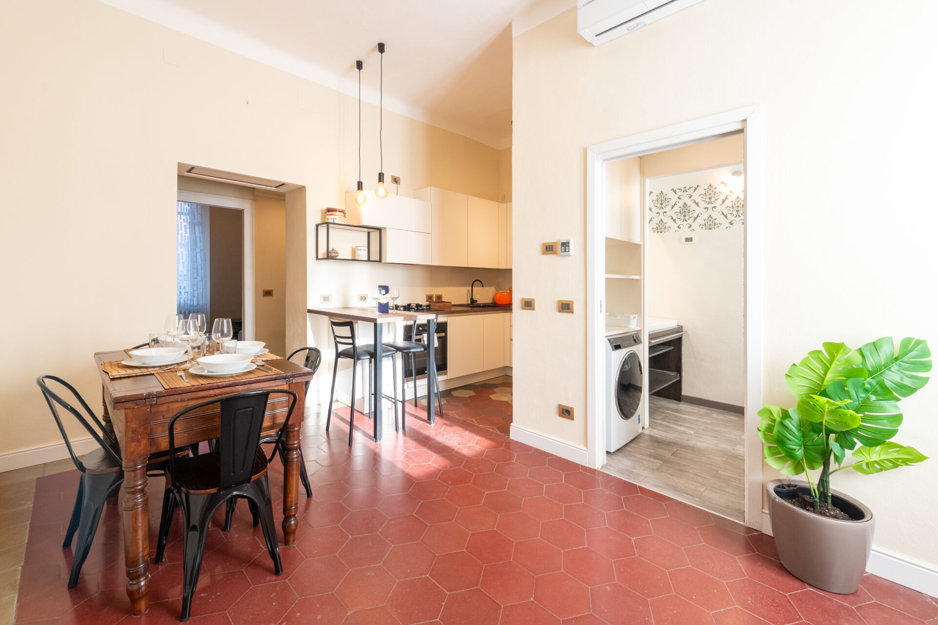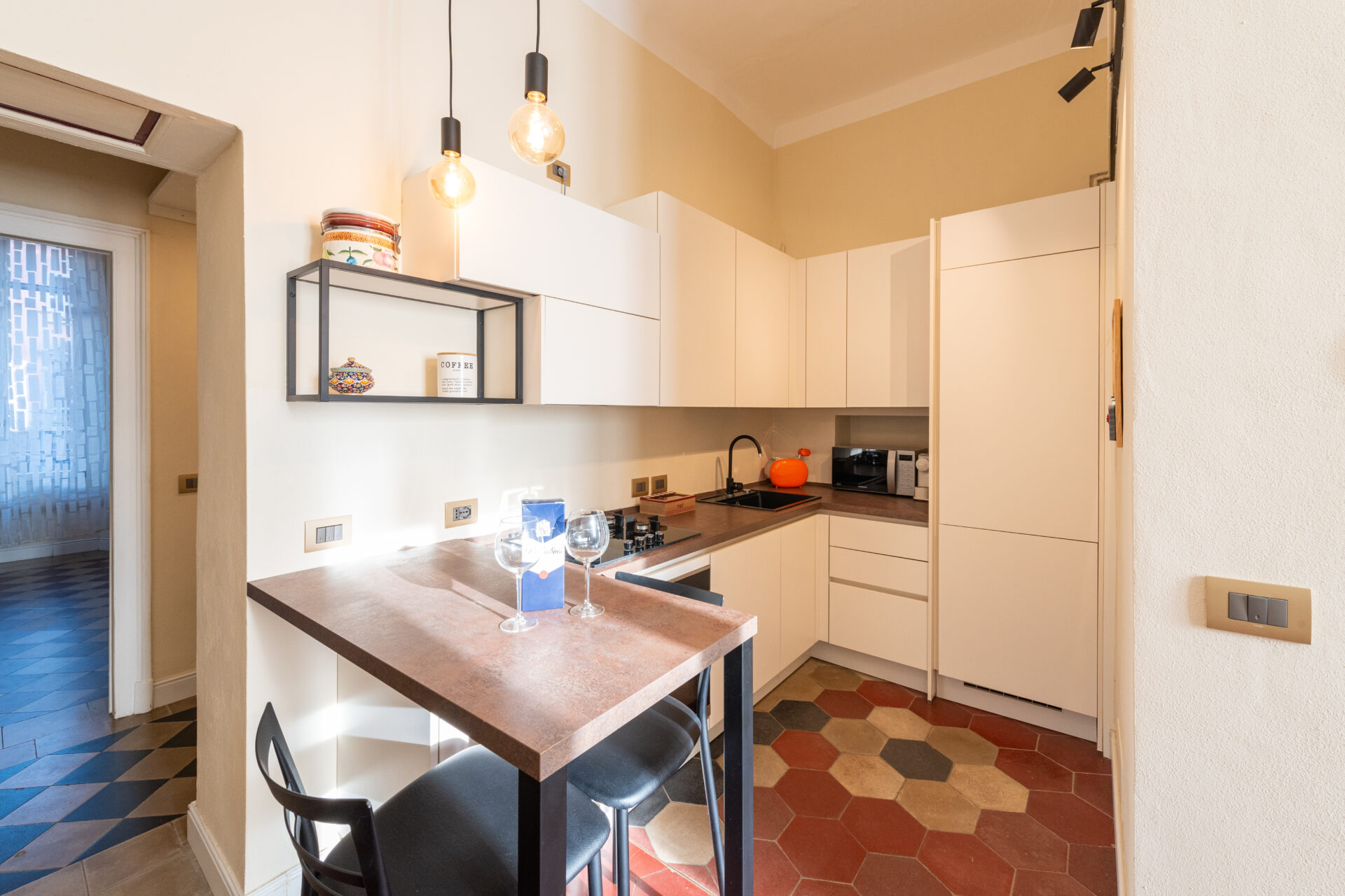Entrando all’interno dell’appartamento verrete subito accolti dalla luminosa ed ampia sala da pranzo, dotata di cucina a vista completa di ogni tipo di comfort ed elettrodomestico, dai fornelli a gas, al forno fino ad arrivare alla macchinetta del caffè Nespresso ed al bollitore elettrico.